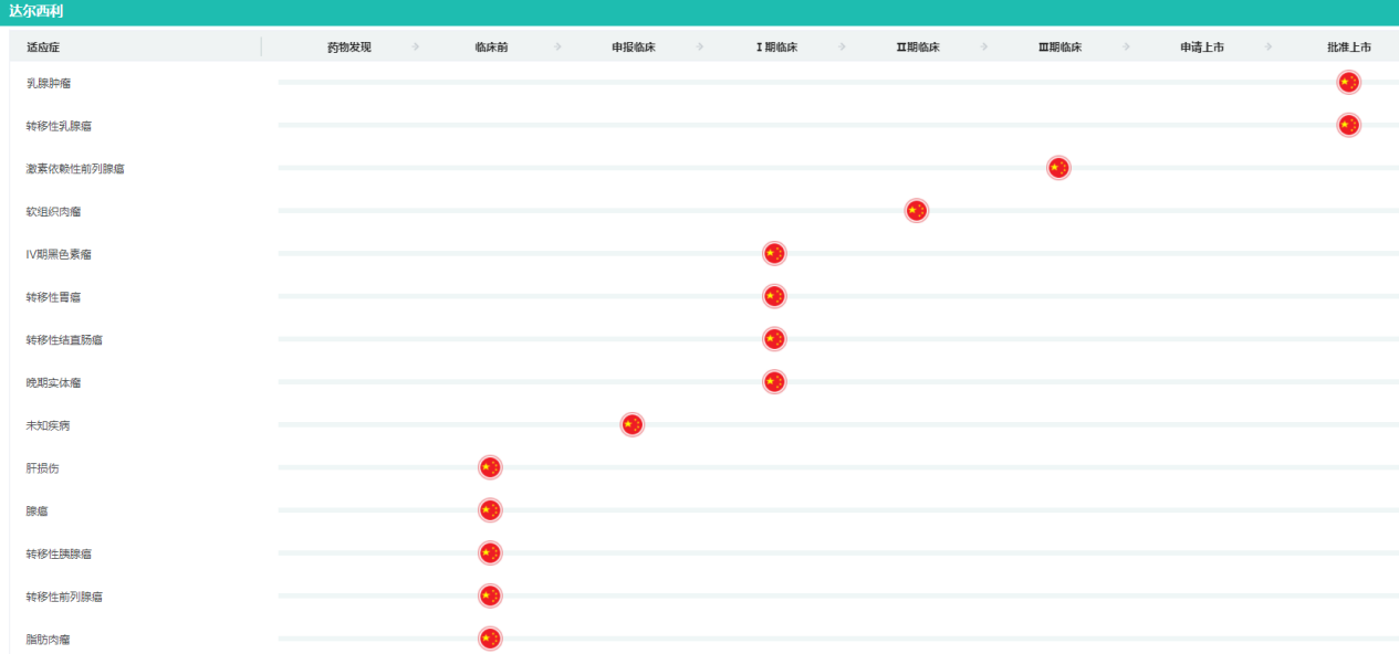 据药融云数据库显示,除乳腺癌、前列腺癌布局外,达尔西利还布局有软组织肉瘤、胃癌、结直肠癌、卵巢癌、肾癌、腺癌、黑色素瘤等适应症。这些研究将进一步拓展达尔西利的适应症范围,为更多类型的肿瘤患者带来希望。