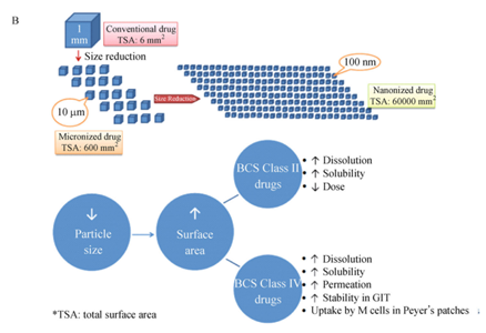 图2 Comparison of micro-sized and nano-sized drug crystal in size and distribution in droplets [2]; (B) Advantageous absorption behavior of drug nanocrystals beyond micronized drug