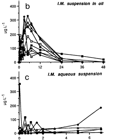 通过文献[17]发现,将青蒿素制备成油混悬剂和水混悬剂,分别肌肉注射给10名志愿者,结果惊奇地发现,青蒿素的油混悬剂在体内的吸收明显快于水混悬剂,结果见下图7,其中b为青蒿素油混悬剂,c为青蒿素水混悬剂:通常情况油混悬或水混悬被认为是一种缓释体系,而且油在体内吸收是相当慢的,有时候油在体内可长达一个月,而本文献中药物形成的油混悬剂的吸收快于水混悬剂,主要可能是青蒿素快速溶于油中,然后再从油中分配到组织液中,而青蒿素在水中不溶,因此,没有油起媒介的作用,最终导致青蒿素水混悬剂慢于油混悬剂。通过查找文献[18]得知青蒿素在水中的溶解度小于在油中的溶解度,青蒿素在水中和不同pH条件下溶解度为60ug/ml~82ug/ml,而青蒿素在不同油中的溶解性为1.4mg/ml~10mg/ml,在pH7.4的油水分配系数为1.58。