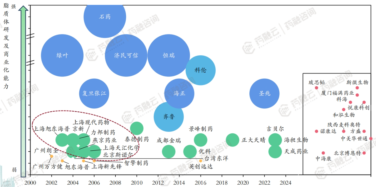 不过,当前仅少数大型企业投入复杂制剂改良型新药研发,如石药、绿 叶、恒瑞、科伦;其中石药、 绿叶、恒瑞已经成功商业化项目。虽然具备脂质体技术的企业众多,但目前仍以仿制药项目为主, 国内大量具备脂质体技术的企业项目超10年无进展,其研发能力存疑,脂质体注射液目前已并非行业 热点,企业数量整体较少。
