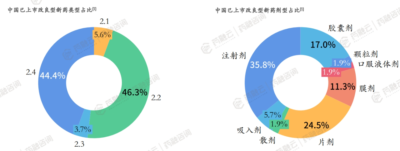 在中国改良型新药的发展进程中,2.2类与2.4类新药成为改良型新药研发的重点方向。在药品剂型方面,注射剂和片剂更是备受瞩目,从药品类型看,中国已上市改良型新药以2.2类、2.4类为主。同时,在剂型方面,中国已上市改良型新药以注射剂、片剂、胶囊剂、膜剂为主。