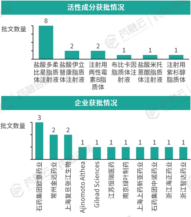 根据药融云数据库,目前我国在使用状态的脂质体注射剂批文共有15条。对应6个活性成分,其中盐酸多柔比星脂质体获批批文最多,共有八条,分别来自于浙江海正药业、上海复旦张江生物医药、浙江智达药业、常州金远药业、石药集团欧意药业等5家制药企业。