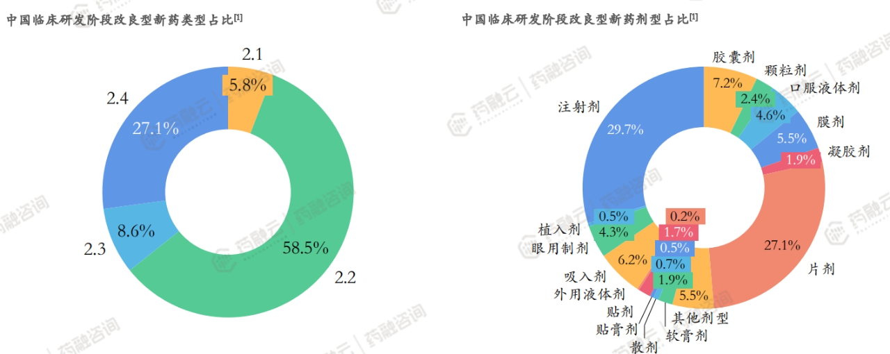 在中国改良型新药的研发领域中,2.2类新药无疑是当前的研发重点。从药品类型看,中国处于临床研发阶段的改良型新药以 2.2类为主;从剂型方面看,中国处于临床研发阶段的改良型新药剂型种类较多,但仍以注射剂、片剂为主。