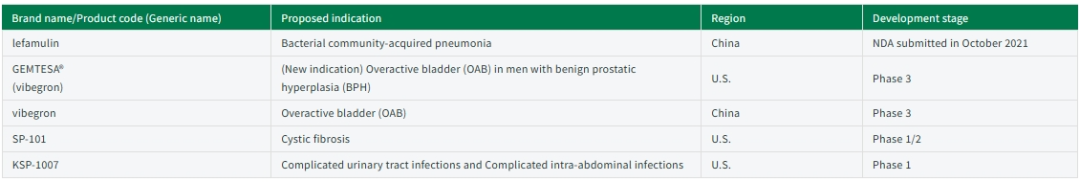 KSP-1007可抑制β-内酰胺酶,该酶由可降解碳青霉烯类抗生素的细菌产生。KSP-1007与美罗培南水合物(一种全球通用的碳青霉烯类抗生素,住友制药在国内市场的产品名称为Meropen)联合用药,有望成为治疗耐碳青霉烯类细菌感染的有效选择。FDA于2022年8月授予KSP-1007合格传染病产品(QIDP)资格和快速通道指定,用于复杂性尿路感染、复杂性腹腔内感染、医院获得性细菌性肺炎和呼吸机相关性细菌性肺炎的适应症。目前在美国针对复杂性尿路感染和复杂性腹腔内感染的研究进行到临床试验1期。