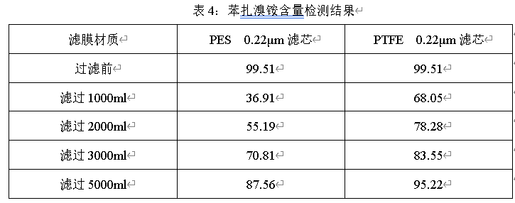 经过上述考察可知,不同材质滤芯对苯扎溴铵均有吸附。在废弃相同体积后,PTFE过滤的药液苯扎溴铵含量比PES更高,说明PTFE对苯扎溴铵的吸附与PES相比更小。