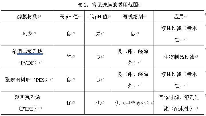 下表将常见的滤膜适用范围进行梳理,研发工作者可以结合开发的品种性质对照下表进行选择: