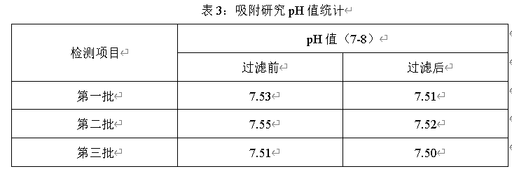 经过三批过滤药液前和过滤药液后的pH值可知,过滤后的药液pH值与过滤前药液的pH值相比略微降低,但是过滤前后pH值无显著变化,通过pH值变化情况,进一步证实该过滤器对过滤药液无吸附。
