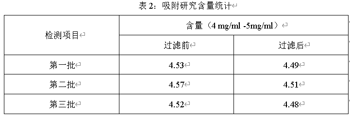 选择三个批次药液,分别在过滤前和过滤后测定含量,对比过滤前和过滤后含量的变化,结果见下表