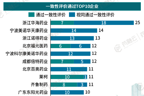 其一致性评价通过TOP10企业分别是:浙江华海药业、宁波美诺华天康药业、浙江诺得药业、北京福元医药、宁波科尔康美诺华药业、成都倍特药业、北京百奥药业、莱柯、齐鲁制药、广东东阳光药业。