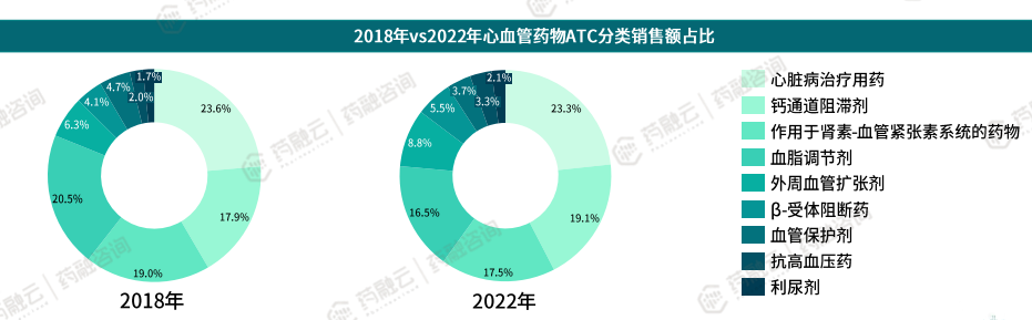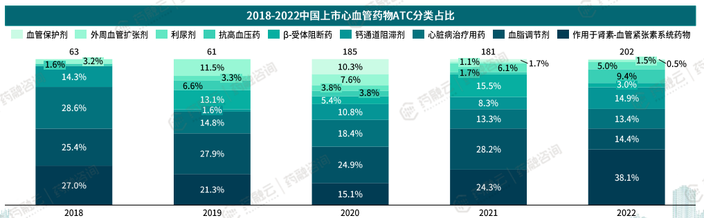 2018-2022中国上市心血管药物ATC分类占比