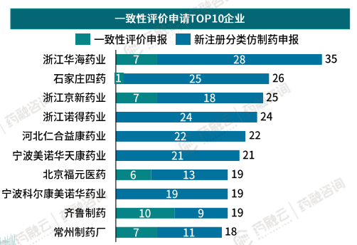 可以看到,华海药业、诺得药业、美诺华天康药业、福元医药、齐鲁制药等企业的一致性评价申请及通过数量,均位于前列。其中,华海药业以35个一致性评价申请,25个一致性评价通过,位居榜首。