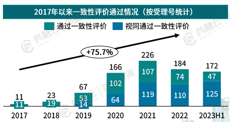 2017年以来心血管系统疾病仿制药一致性评价承办及通过数量也在逐年增长。据药融云数据库统计,2017年以来共1691个心血管系统仿制药一致性评价申请获CDE承办,年复合增长率达52.35%。其中,2022年共385个仿制药一致性评价获CDE承办,包括一致性评价申请92个,新注册分类仿制药申报293个。(注:数据截至2023年6月30日,下同)