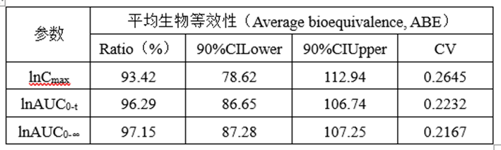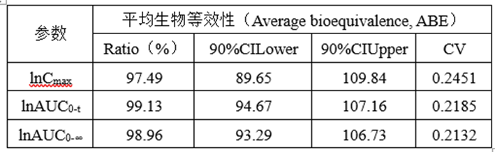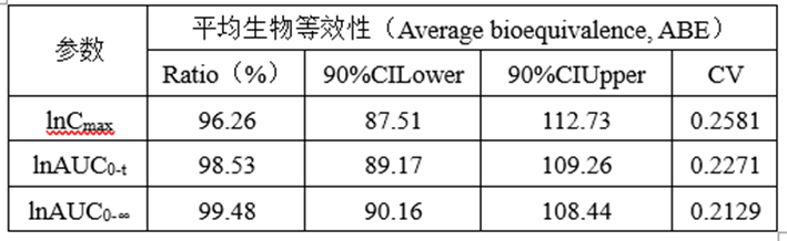 采用平均生物等效性(Average bioequivalence, ABE)方法,等效标准为受试制剂与参比制剂的主要药动学参数(AUC和Cmax)几何均值比的90%置信区间在80.00%~125.00%范围内。