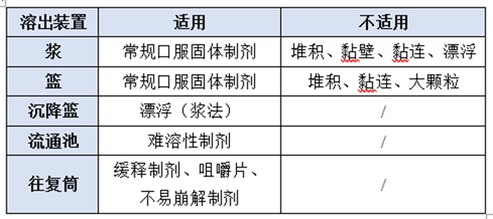 根据制剂类型、试验现象选择适宜的溶出装置,常用的溶出装置包括桨、沉降篮、篮、往复筒、流通池等。