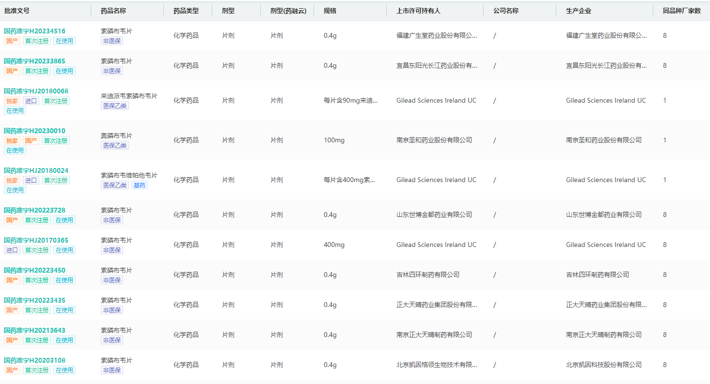 药融云数据库显示,目前国内已有多个NS5B聚合酶抑制剂获批上市,包括雅培制药/艾伯维的达塞布韦,BMS的贝卡布韦,圣和药业的奥磷布韦,吉利德的索磷布韦+维帕他韦+伏西瑞韦、索磷布韦+来迪派韦等。