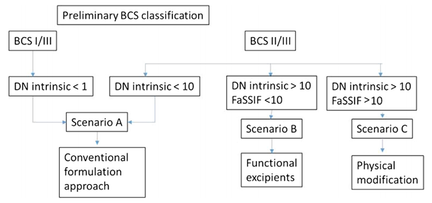 从决策树可以看到,有三种不同的配方方案(A、B和C)。配方方案A用于固有DN(水中DN)<10的化合物。属于方案A项下化合物可以拟定常规制剂开发,如普通片剂、胶囊剂、溶液剂或者混悬液等,预计不会出现生物利用度问题;固有DN>10的化合物可分为两类。固有DN>10和在FaSSIF<10中DN的化合物归于方案B,在水中和FaSSIF中DN>10的化合物被认为方案C可以有针对的提高化合物的体内吸收。