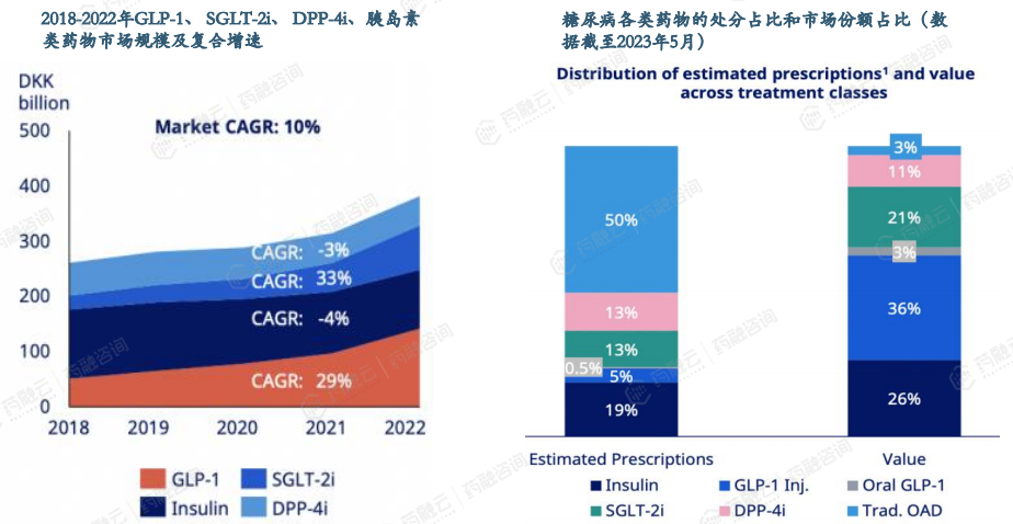 全球糖尿病领域GLP-1RA市场份额已达39%,超胰岛素。根据诺和诺德公司财报,2018-2022年SGLT-2i及GLP-1RA市场规模分别保持33%、29%的CAGR,DPP-4i、胰岛素市场规模下降。截至2023年5月,尽管GLP-1类药物处方量渗透率仅5.5%(注射剂5%、口服0.5%),但糖尿病药物市占率已达39%(注射剂36%、口服3%),超过胰岛素成为全球第一大糖尿病治疗药物类型。