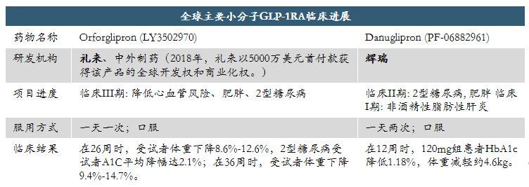 目前大多数的GLP-1RA均为注射给药,诺和诺德的口服司美格鲁肽Rybelsus为首个且唯一上市的口服GLP-1RA,但服用要求严格、繁琐。尚无非肽类口服小分子GLP-1RA获批上市,进度最快的为礼来和中外制药合作研发的Orforglipron为小分子口服GLP-1RA药物,目前在临床III期阶段。