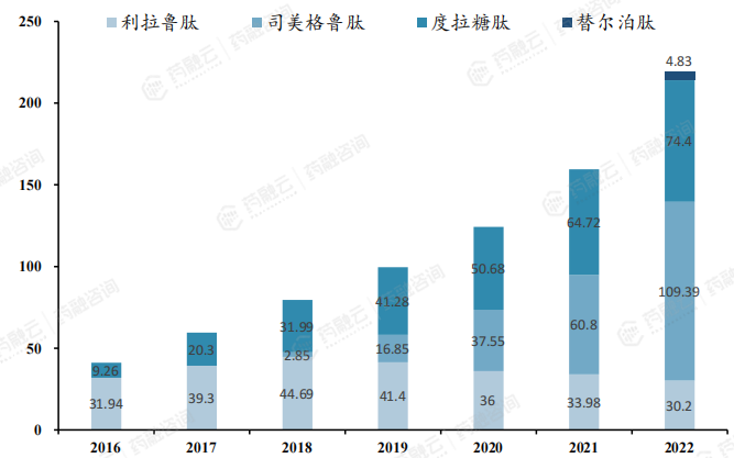 利拉鲁肽、司美格鲁肽、度拉糖肽、替尔泊肽这四款主流GLP-1RA药物2022年销售额达到了218.82亿美元(yoy+37%),其中减肥药适应症销售额占比为11%。