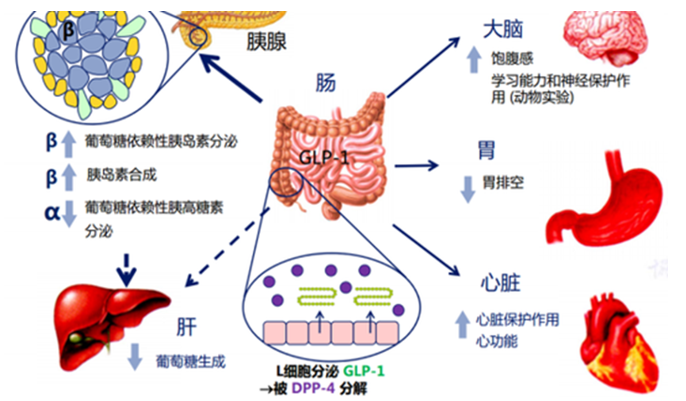 GLP-1的受体激动剂(GLP-1RA)通过多种降糖机制稳定血糖,降低体重。如作用于胃部,通过抑制胃肠道蠕动,延缓胃排空;作用于中枢神经系统(特别是下丘脑),增加饱腹感,抑制食欲;作用于肝脏,抑制肝糖输出;促进胰岛素刺激外周组织对葡萄糖的摄取(增加胰岛素敏感性)等。
