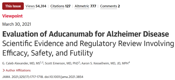 6. Alexander GC, Emerson S, Kesselheim AS. Evaluation of Aducanumab for Alzheimer Disease: Scientific Evidence and Regulatory Review Involving Efficacy, Safety, and Futility. JAMA. 2021 May 4;325(17):1717-1718. doi: 10.1001/jama.2021.3854. PMID: 33783469.