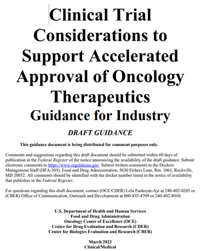 2023年3月,FDA发布了名为“Clinical Trial Considerations to Support Accelerated Approval of Oncology Therapeutics”新行业指南草案,概述了这一重要药物批准计划的潜在改革。