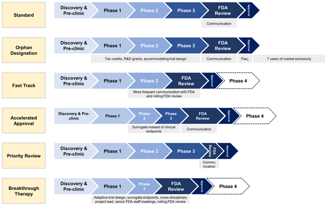 尽管药物审批流程的标准(安全性和有效性)自1962年成立以来一直未变,但包括加速审批在内的五种特殊指定和审查途径为公司在针对疾病和治疗的临床试验中研究药物提供了更大的灵活性,也为FDA根据更广泛的疗效指标批准药物提供了更大的灵活性。