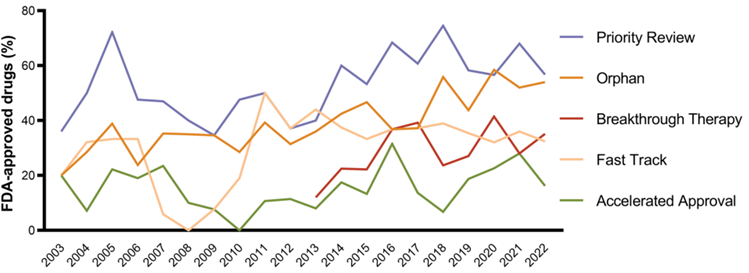 在过去20年中(2003年-2022年),FDA批准的药物中三分之二的新药至少获得一个特殊称号。在新药批准中,有55%药品获得优先审查、42%被指定为孤儿、32%获得快速通道、29%获得突破性治疗和15%获得加速批准。