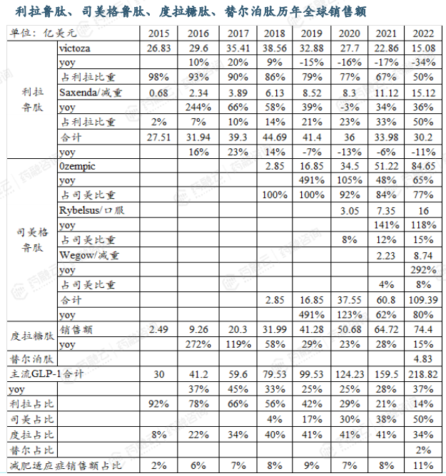 四款主流GLP-1RA药物利拉鲁肽、司美格鲁肽、度拉糖肽、替尔泊肽在2022年销售额达到了218.82亿美元(yoy+37%),其中减肥药适应症销售额占比为11%。