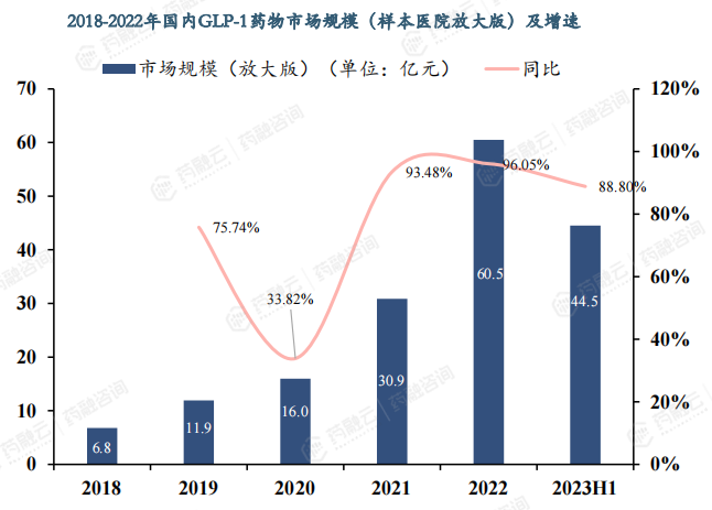 与国内市场相比,国外的GLP-1RA市场已经相当成熟,国内GLP-1RA仍处于市场导入期。根据PBD样本医院放大版销售数据,我国GLP-1市场规模从2018年的约6.8亿元高速增长至2022年的约60.5亿元,复合增速达70.5%。