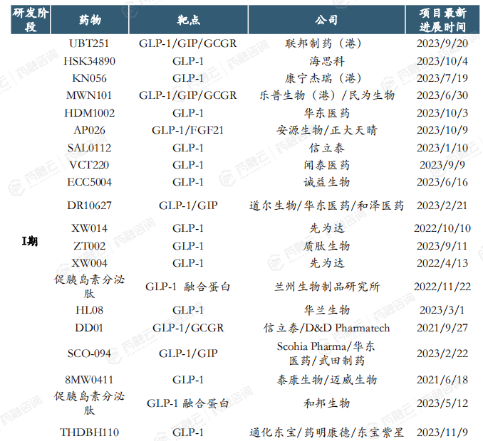 处于II期临床的有6款,包括 Gasherbrum/硕迪生物的GSBR-1290、恒瑞医药/豪森药业的诺利糖肽、豪森药业的HS-20094、恒瑞医药/盛迪医药的HRS9531、甘李药业的GZR18、博瑞医药的BGM0504;其他多数处于临床I期。