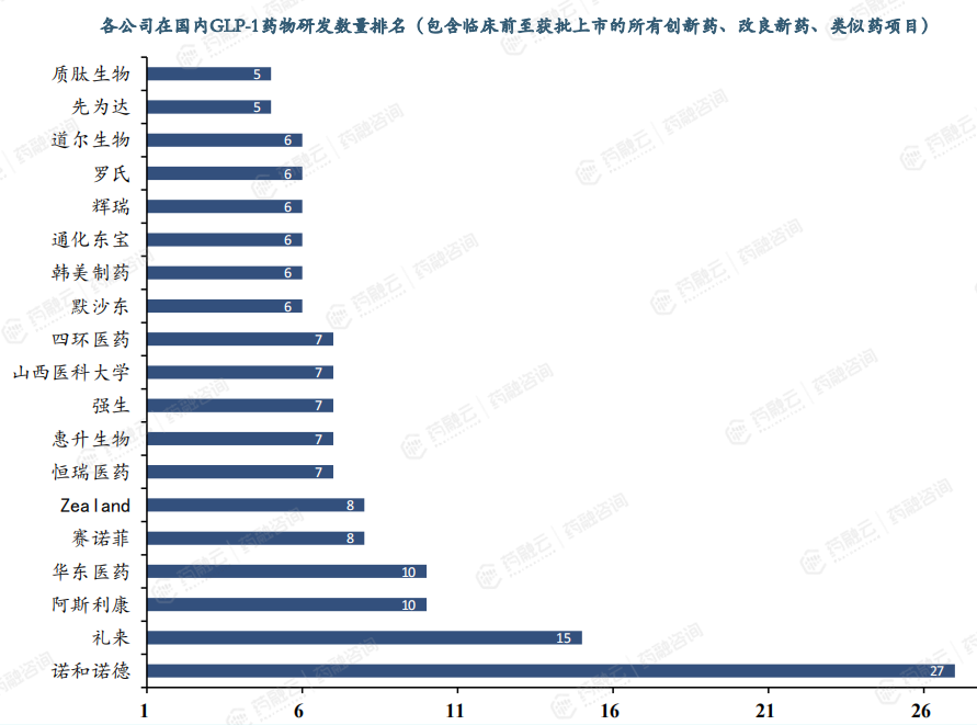药融云数据库显示,目前国内GLP-1临床管线数量排名前三的仍为诺和诺德、礼来和阿斯利康国际制药巨头。