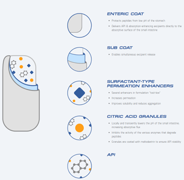 Peptelligence技术其核心包括冻干肽、麦芽糊精包被的柠檬酸和酰基肉碱。其中配方材料中的柠檬酸为酶抑制剂(通过降低肠道酸碱度来抑制酶的降解作用),酰基肉碱为渗透促进剂(通过暂时性地打开上皮细胞之间的紧密连接来促进细胞旁转运,从而增强肽类药物的吸收)。