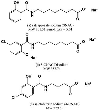 除了最先进火热的SNAC,其他化合物如5-CNAC(8-(N-2-羟基-5-氯苯甲酰基)-氨基辛酸酯)和4-CNAB(N-(4-氯水杨酰基)-4-氨基丁酸酯)也随之发展出来。