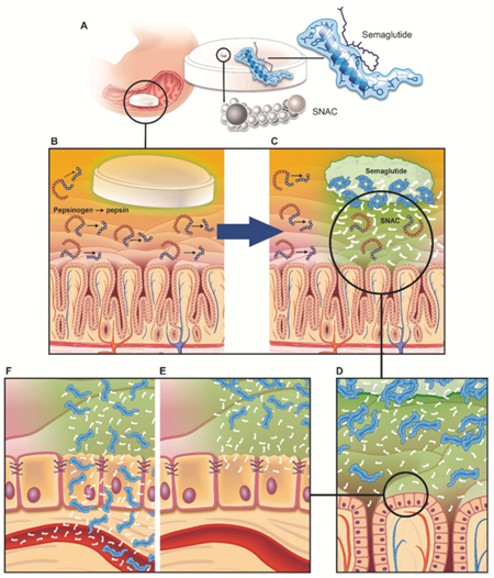 图2:Rybelsus 片剂的配方设计及SNAC索马鲁肽吸收增强机理示意图。Rybelsus 片剂(A)从胃粘膜表面(B,C)完全侵蚀,SNAC增加局部pH值以防止胃蛋白酶(C)降解semaglutide。此外,它间接削弱了肽的自缔合,有助于维持单体状态(D),并通过增加膜流动性(E,F)增加跨细胞吸收。