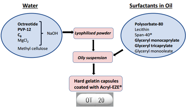 TPE制剂是一种油性悬浮液,由醋酸奥曲肽、C8和聚乙烯吡罗烷酮(PVP)组成的可溶性亲水性微粒分散在由单癸酸甘油和三丙烯酸甘油组成的油混合物中。它与肠液混合时溶解,成为典型的药物悬浮液。