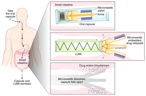 微针的递送策略的表明即使分子量较大,也非常适合各种多肽药物的递送。Prausnitz等人利用微针技术进行口服药物递送,口服胶囊包含从肠内胶囊射出的腔内展开微针注射器(LUMI)。LUMI的手臂按压插入肠上皮的微针贴片,在那里它们溶解并释放包裹的生物药物。胶囊破裂,LUMI在被排出体外之前迅速生物降解。