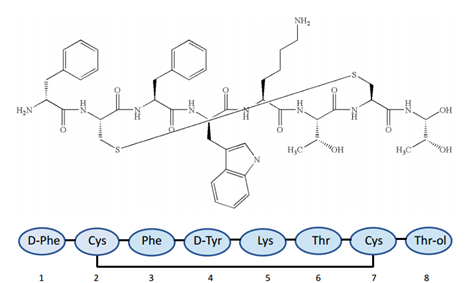 图6:奥曲肽的结构。上部:化学结构。下:氨基酸序列。生长抑素受体结合所必需的氨基酸残基编号为3-6