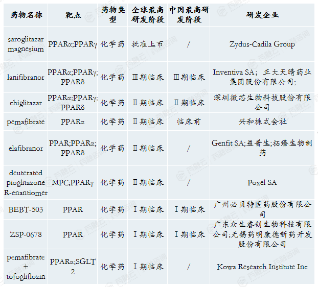 PPAR靶点研发进度靠前,目前已有药物获批上市。