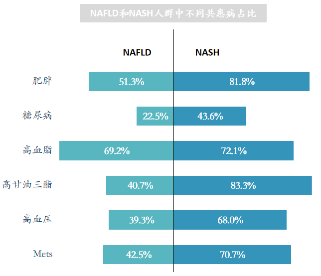 NAFLD和NASH患者多合并有二型糖尿病和肥胖等代谢类疾病。NAFLD/NASH和肥胖、2型糖尿病、高血脂,高甘油三酯、和高血压以及Mets类疾病密切相关。尤其是在NASH人群中,有高达81.8%的人群肥胖,NASH糖尿病患者的比例是NAFLD的大约一倍。