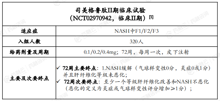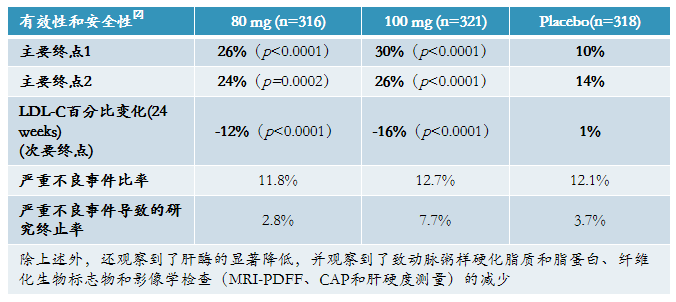 72周时,0.4mg组有59%的人群达到NASH缓解且肝纤维化等级未恶化,且具有统计学意义,安慰剂组为17%,达到了主要临床终点;但次要临床终点未达到。除此之外,还观察到了肝酶水平的降低。