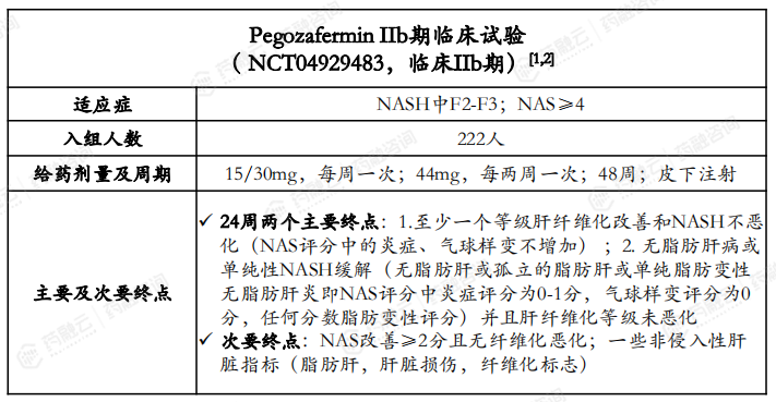 Pegozafermin超长半衰期,处于FGF21靶点研发前列。Pegozafermin是89bio Inc采用glycoPEGlation技术研发的一款FGF21类似物,可以延长其生物活性时间,同时保持天然FGF21的有效性,在改善NASH的同时,Pegozafermin还具有显著降低甘油三酯的效果NASH疾病领域2b期完成后,计划2023下半年开始进行3期临床研究。