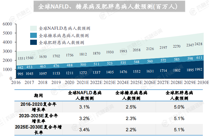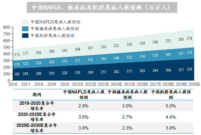 中国糖尿病患病人数从 2016 年的1.2亿人上升到 2020 年的1.3亿,复合年增长率为3.0%,中国糖尿病患病人数将在 2025 年接近1.5亿,并于 2030 年超过1.7亿;中国肥胖患病人数从 2016 年的1.8亿人上升到 2020 年的2.2亿,复合年增长率为5.0%,中国肥胖患病人数将在 2025 年接近2.7亿,并于 2030 年超过 3 亿;中国NAFLD患病人数从 2016 年的 1.7亿人上升到 2020 年的 2.0 亿,年复合增长率为 2.9%;在肥胖、糖尿病等疾病因素的作用下,2021-2030 年,中国NAFLD患病率会以更快的速度增长,将于 2030 年达到 2.8 亿人。