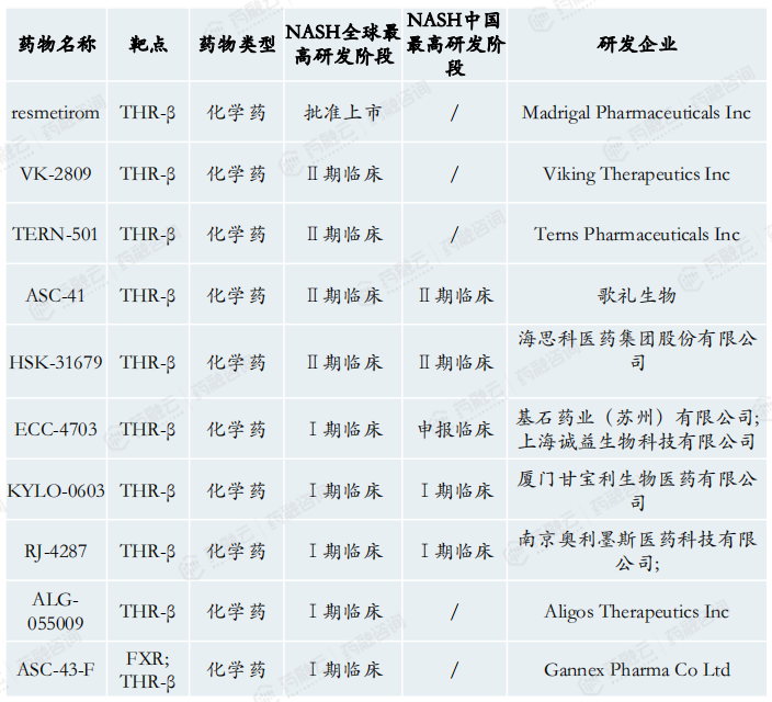 THR-β-专注于NASH疾病的脂代谢靶点。甲状腺激素通过激活肝细胞中的β受体,在肝功能中起着核心作用,影响从血清胆固醇和甘油三酯水平到肝脏中脂肪的病理性堆积等一系列健康参数。THR-β作用是正常肝功能的关键,包括调节线粒体活性,如肝脏脂肪分解和控制正常、健康的线粒体水平。NASH患者肝脏中的THR-β受体活性水平降低。