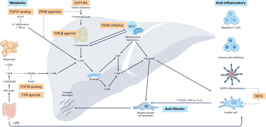 这种疗效是通过两种潜在途径介导的:首先,通过改善代谢,减少了持续的肝损伤,从而给肝脏时间进行愈合。其次,FGF21产生靶效应会增加脂联素,脂联素是一种从脂肪组织释放的激素,可以抑制肝纤维化的发生和进展。