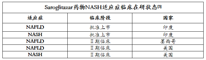 PPARα/PPARγ双重激动剂-Saroglitazar 2020年在印度获批。Saroglitazar是2020年3月印度药企Zydus-Cadila Group在印度获批上市非脂肪型肝炎适应症的一款药物。此药目前在印度已获批了包括非酒精性脂肪肝病和非酒精性脂肪肝炎在内的共计5个适应症(2型糖尿病、高甘油三酯血症、糖尿病血脂异常[2] )。但目前该药物未在美国,欧盟和日本等国家地区获批。
