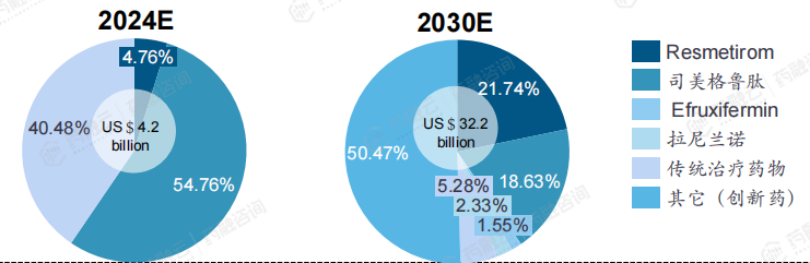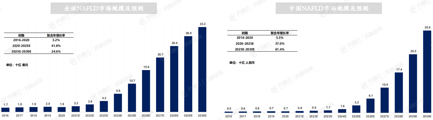 NASH 药物市场从 2016 年的 5亿人民币增至 2020 年的 7 亿人民币,复合年增长率为 5.5%。未来随着创新药走向大众化,会呈现明显的增长,到 2025 年预计将达到 32 亿人民币,并于 2030 年达到 355 亿人民币,期间复合年增长率为 37.0%和 61.4% 。