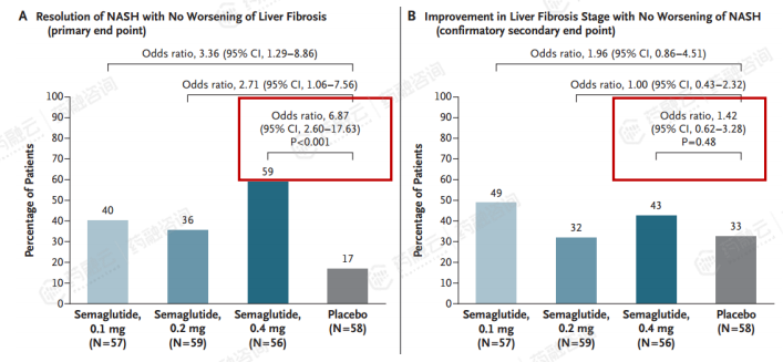 24周时,28mg和44mg组有39%和41%的人群达到肝纤维化改善且NASH不恶化,具有统计学意义,安慰剂组为20%; 同时28mg和44mg组有76%、47%患者达到显著NASH缓解且肝纤维化等级未恶化,安慰剂组为15% 。达到了主要重点和一个关键次要终点。除此之外,还改善了一些包括肝酶在内的其他指标。