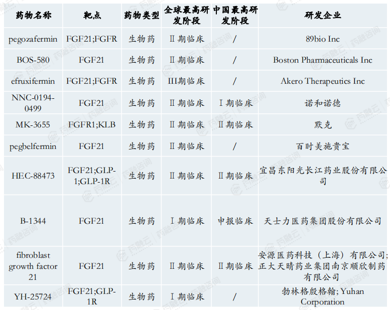 FGF21在NASH研发火热,多个药物临床II期达到终点。FGF21是一种内源性代谢激素,具有调节能量消耗和糖脂代谢的作用。FGF21药物已显示出减少肝脏纤维化的疗效。