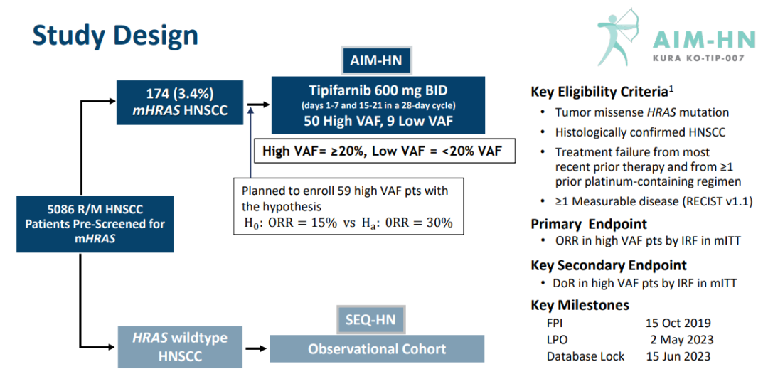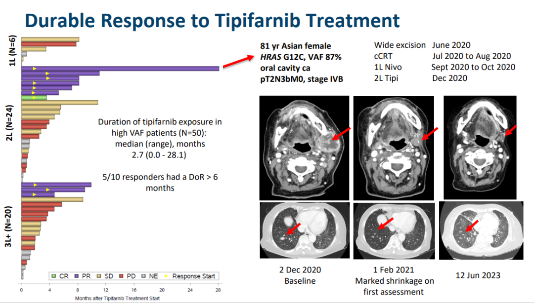 Kura的第二个候选产品Tipifarnib是一种强效、选择性和口服生物可利用的法尼基转移酶抑制剂(FTI),此前已在5000多名癌症患者中进行了研究,并在某些患者中表现出引人注目和持久的抗癌活性,且副作用可控。2021年2月,替匹法尼被FDA授予突破性治疗指定,用于治疗复发性或转移性HRAS突变头颈部鳞状细胞癌(HNSCC)患者,这些患者在接受以铂为基础的化疗或高VAF后出现疾病进展,且变异等位基因频率≥20%。